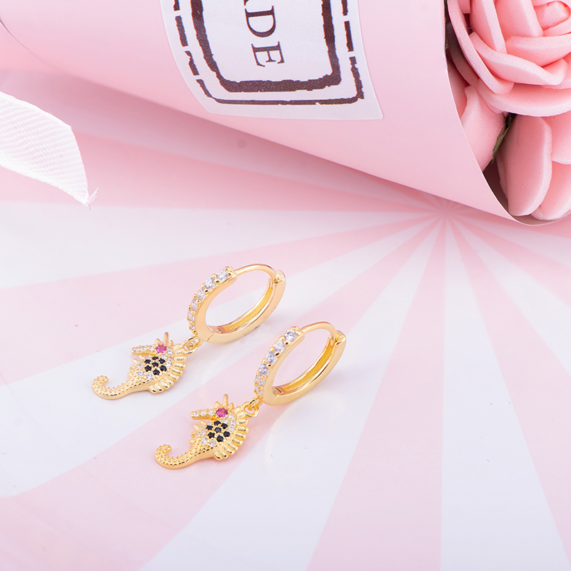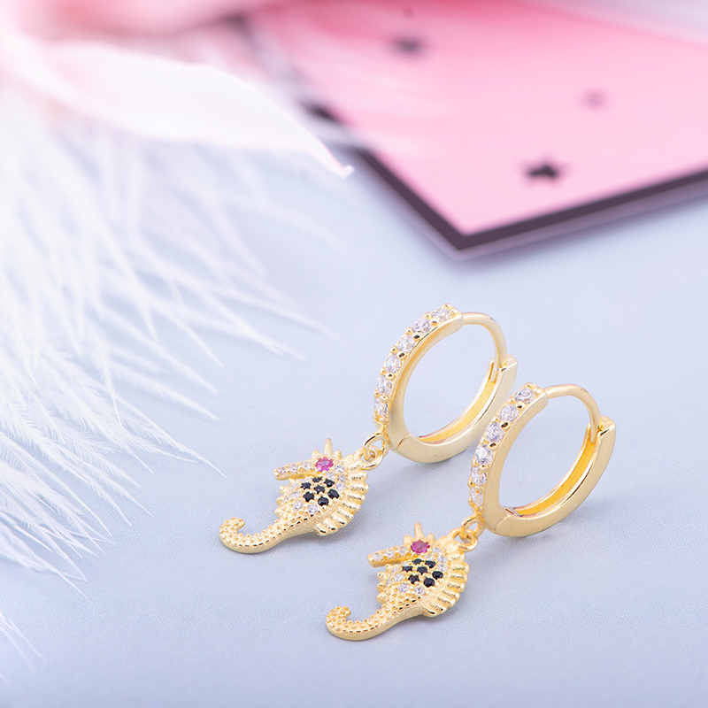 The earrings in the shape of a seahorse give a very small and cute feeling. Suitable for girls with a gentle temperament. They are really beautiful. The whole is inlaid with colored zircon, which is very eye-catching and high-grade. When the sun shines, it glows dazzlingly with a radiant finish that goes well with everyday wear. Not exaggerated, but looks good. Choose it to help you create a more refined look. Add a touch of natural beauty to your look Seahorse Stud Earrings in 18k Yellow Gold on Sterling Silver add a touch of brilliant round coloured cubic zirconia to your collection. These beautifully crafted 925 sterling silver lever-back drop earrings will give you a captivating nautical style. Highlighted by a quirky, delicate seahorse pattern in luminous sterling silver.