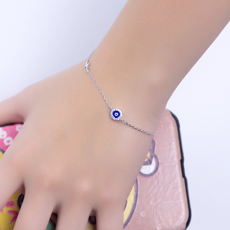 incógnita&H SILVER handmade bracelet in sterling silver for every woman. She is an evil eye bracelet with unique mother-of-pearl eyes. The white zircon around the eyes and the highly polished cross all over the body make you shine everywhere and become a dazzling presence.